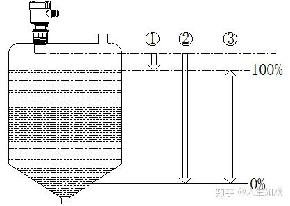 2、超声波液位计的测量范围(工作范围)和最大的测量间距有所不同,具体如图2所示(①为满,②为空(最大测量间距),③测量范围)。