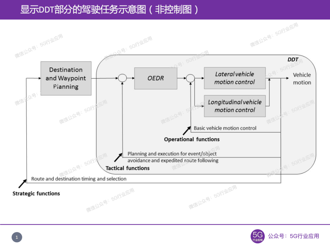 动态驾驶任务DDT(Dynamic Driving Task)是在道路交通中操作车辆所需的所有实时操作和策略功能,不包括行程安排和目的地和航路点选择等战略功能,包括但不限于以下子任务: