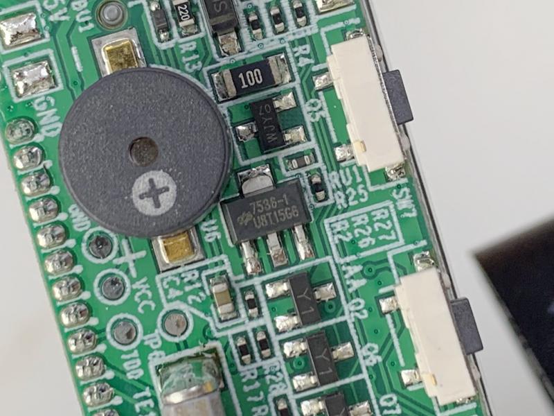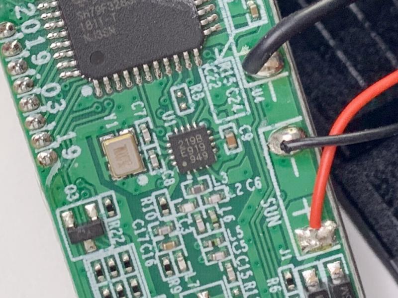 除了这两个重点芯片外,板子上其它的器件或者接口电路较为常见,包括用于有线充电的microUSB接口,太阳能充电接口,电池供电接口,充电管理芯片,合泰的LDO(HT7536-1 ),用于胎压出现问题时发出“滴滴滴”提示声的蜂鸣器等。
