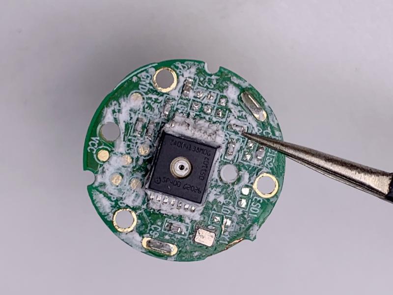 传感器可以通过附赠的工具拆解到更换电池这一步,传感器在结构设计时充分考虑到了防水的需求,采用类似LED灯泡一样的灌胶封装工艺,拆解比较麻烦,拆解之后可以看到传感器采用的电池规格为CR1632。
