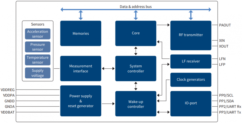 可以看下上图这张硬件框图,集成了高效的电源管理和集成微控制器;集成了 LF 接收器和 RF 发射器允许无线通信; 对于有线数据传输,可以使用硬件 I²C 和 UART 接口; 可以在软件中实现更多有线接口,例如 SPI 或 PWM。