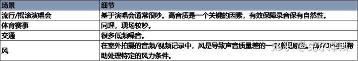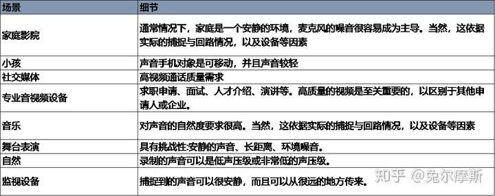 音频/视频录制的目的是捕捉来自受试者的传入声音,并将其复制到麦克风系统的输出中。当录音是为人类的耳朵,它是可取的电子输出信号匹配的声音信号尽可能接近,提供一个“自然”的声音记录。麦克风及其信噪比是声捕获信号链的关键部分,影响录音质量。下表给出了一些典型的用例。