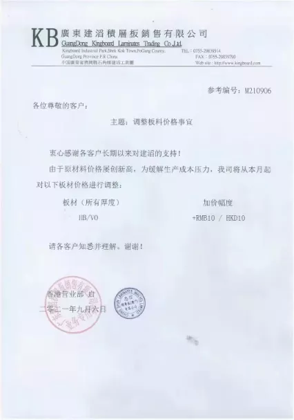 近日,覆铜板龙头厂商建滔积层板发布了调涨板料价格事宜通知。建滔积层板表示,由于原材料价格屡创新高,为缓解生产成本压力,公司从本月起对板材(所有厚度)HB/VO+,加价RMB10/HKD10。