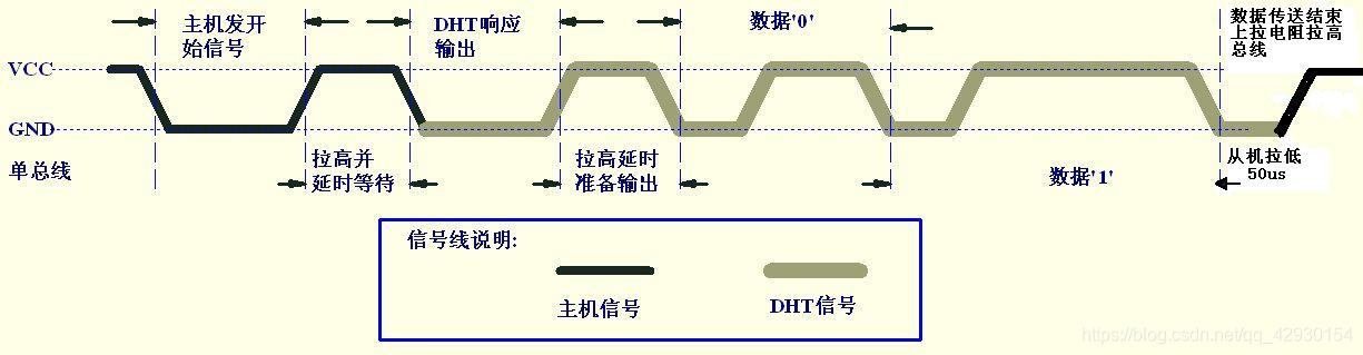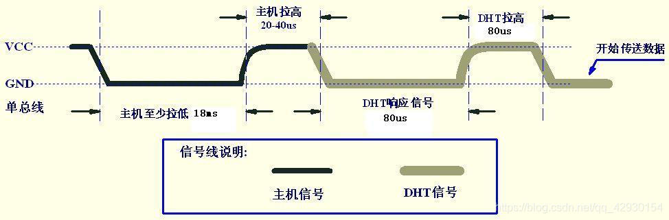 总线空闲状态为高电平,主机把总线拉低等待DHT11响应,主机把总线拉低必须大于18毫秒,保证DHT11能检测到起始信号。DHT11接收到主机的开始信号后,等待主机开始信号结束,然后发送80us低电平响应信号.主机发送开始信号结束后,延时等待20-40us后, 读取DHT11的响应信号,主机发送开始信号后,可以切换到输入模式,或者输出高电平均可, 总线由上拉电阻拉高。