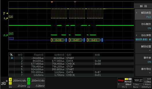 返回到主界面,PS/2协议已经有效解码,打开事件表,旋转旋钮B可对所有解码事件进行查看,在停止状态下,ZDS2022示波器还支持对协议 解码 分析事件表导出功能!