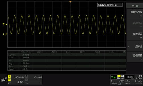 旋转旋钮B,在计数一栏中短按旋钮B选中触发计数器,长按旋钮B可查看触发计数器的帮助信息,波形的触发计数器是指在特定时间内对触发电平交叉点的计数,并已Hz为单位显示结果。返回到主界面,我们可以看到该正弦波的触发电平与上升沿处的触发计数为167Hz,按下频率计软键,选择CH1,可测得该正弦波的频率为12.5KHz,可知,触发计数器的测量结果与该信号的频率并不是一回事。