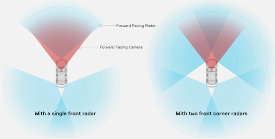 实际上,两个先进角雷达可提供250度的覆盖范围,在车辆前方提供明显的重叠。