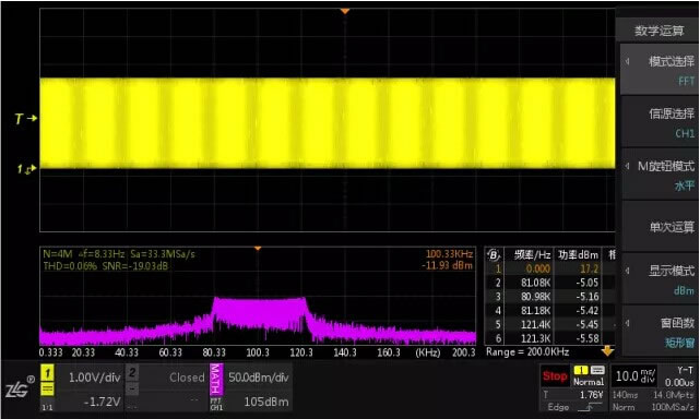 按下【MATH】键,运算模式选择FFT,信源选择通道1,此时可在屏幕上看到FFT频谱图与频率表,ZDS2022示波器最高4Mpts的FFT分析样本点数,频率分析非常精准。