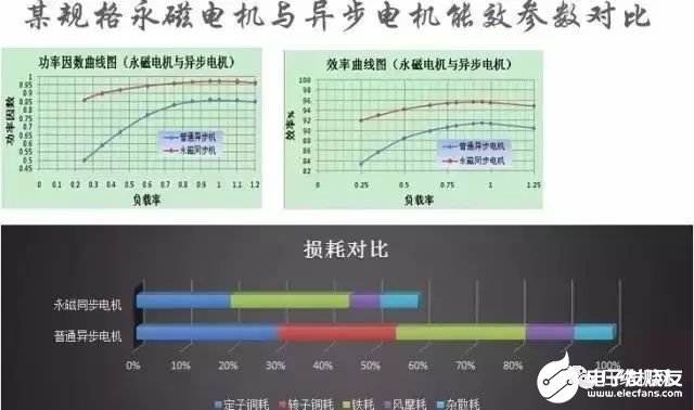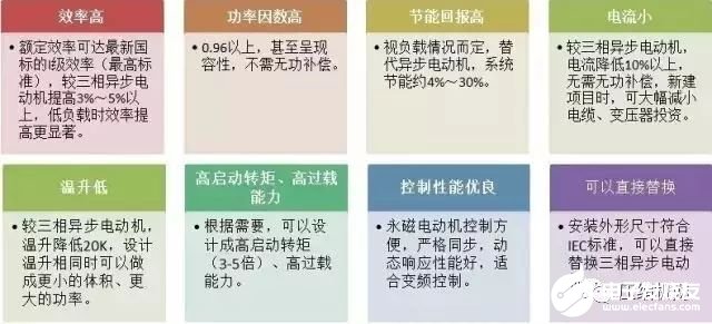 2、高效永磁同步电动机永磁同步电动机与感应电动机相比,不需要无功励磁电流,可以显着提高功率因数(可达到1,甚至容性),减少了定子电流和定子电阻损耗,而且在稳定运行时没有转子铜耗,进而可以减小风扇(小容量电机甚至可以去掉风扇)和相应的风摩损耗,效率比同规格感应电动机可提高2~8个百分点。而且,永磁同步电动机在25%~120%额定负载范围内均可保持较高的效率和功率因数,使轻载运行时节能效果更为显着。这类电机一般都在转子上设置起动绕组,具有在某一频率和电压下直接起动的能力。目前主要应用在油田、纺织化纤工业、陶瓷玻璃工业和年运行时间长的风机水泵等领域。