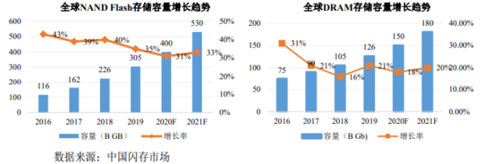 随着数据量的爆炸式增长,海量的数据整理及存储成为了各个企业亟需解决的问题,也进一步拉动了对于存储器的需求。根据中国闪存市场统计,2018年、2019年、2020年全球NANDFlash存容量规模同比分别增长40%、35%和31%,全球DRAM存储容量规模同比分别增长16%、21%、18%。