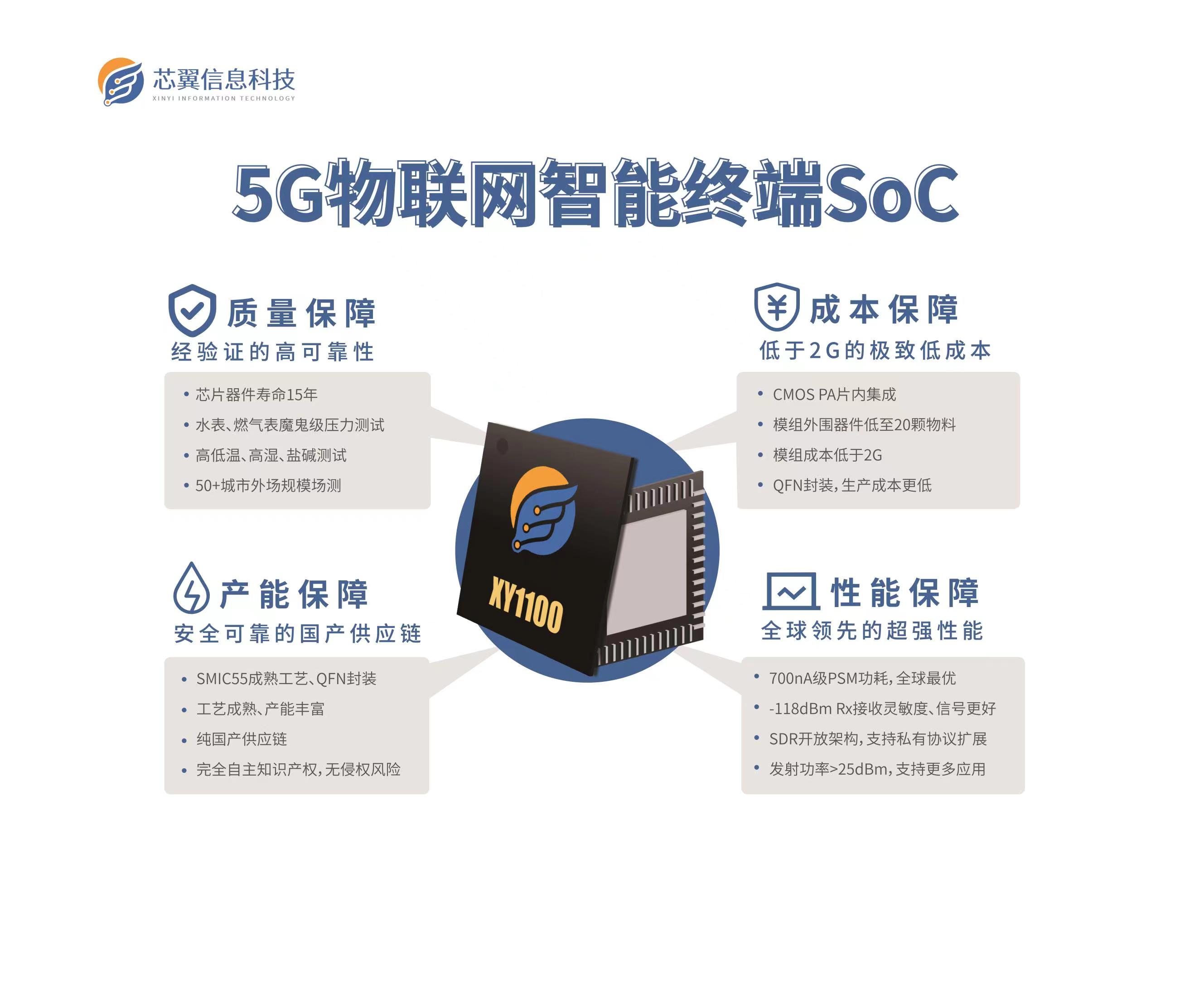 2018年,芯翼信息科技推出的NB-IoT系统SoC芯片XY1100,是全球首颗片内集成CMOS PA的NB-IoT芯片,具有超高集成度、超低功耗、灵活性强、成本低等四大核心优势。这款芯片率先以完全自主研发、自主创新的架构,突破了全球蜂窝通信芯片开发的集成度瓶颈,首次流片即获成功、顺利实现量产,并引领了截止目前全球NB-IoT芯片的技术发展潮流。凭借着优越的产品性能,XY1100备受市场认可。该芯片于2019年便通过了三大运营商的入网入库测试;2020年下半年通过了智能气表、智能水表行业头部客户严苛的认证测试,在同类的初创企业中率先实现千万级大规模出货。目前,XY1100已广泛用于智能表计(燃气表、水表等)、智能烟感、资产追踪、智能换电、共享电单车管理、智能家居等物联网应用场景,合作客户包括中移物联、芯讯通、视源、天喻信息、高新兴物联、涂鸦、移远等业内主流的模组厂商,以及金卡、宁水、积成、千嘉、稳信等智能表计行业的终端客户。