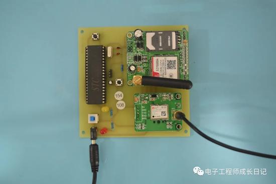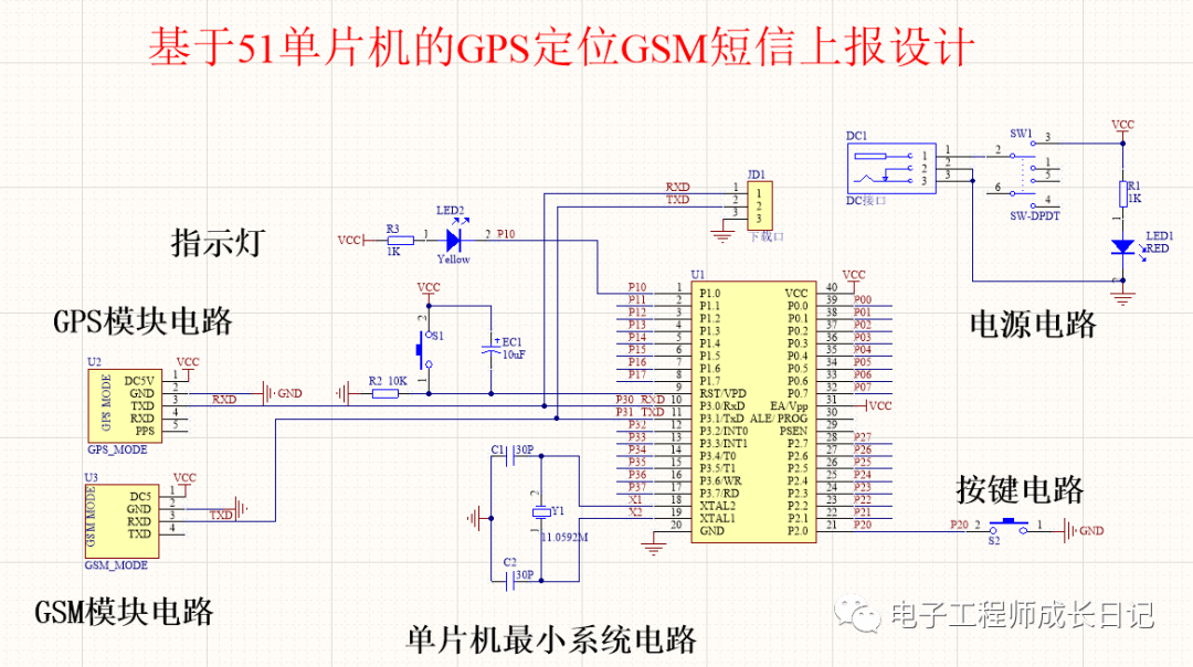 系统由STC89C52单片机电路+GPS模块电路+GSM模块SIM800A+指示灯电路+电源电路组成。