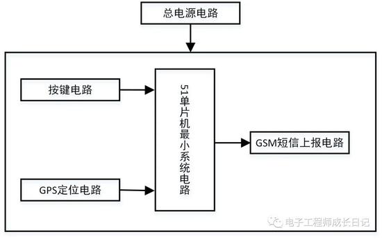 本系统由STC89C52单片机电路+GPS模块电路+GSM模块SIM800A+指示灯电路+电源电路组成。其硬件框图如图。