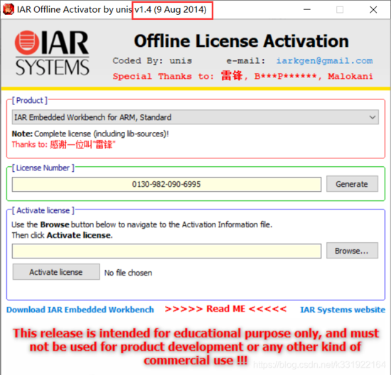 破解工具用IAR Offline License Generator v1.4 by unis。如下图所示。