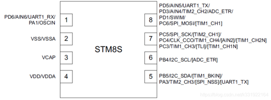 由于STM8S001引脚太少,可用的只有5个引脚。