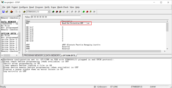 因为STM8S001只有8个引脚,没有RST,如果把ROP改为ON,这样代码不能被读出,也不能写入。