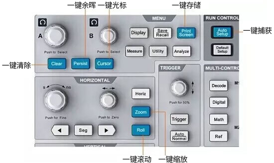 ZDS2022示波器是具有7个“一键操作”功能的,一键余辉、一键光标、一键存储、一键捕获、一键清除、一键缩放和一键滚动。