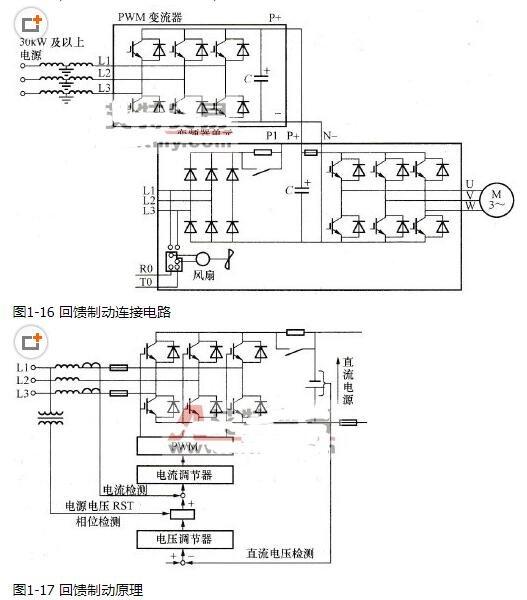 众所周知,一般通用变频器的桥式整流电路是三相不可控的,因此无法实现直流电路与电源间双向能量传递,解决这个问题最有效的办法是采用有源逆变技术,如图1-16所示,即将再生电能逆变为与电网同频率、同相位的交流电回馈电网。在图1-17中,采用了电流追踪型PWM整流器组成方式,这样容易实现功率的双向流动,且具有很快的动态响应速度,相同的拓扑结构使得我们能够完全控制交流侧和直流侧之间的无功和有功功率的交换,且效率可高达97%,经济效益较大,热损耗为能耗制动的1%,同时不污染电网。所以,回馈制动特别适用于需要频繁制动的场合,电动机的功率也较大,这时节电效果明显,按运行的工况条件不同,平均约有20%的省电效果。