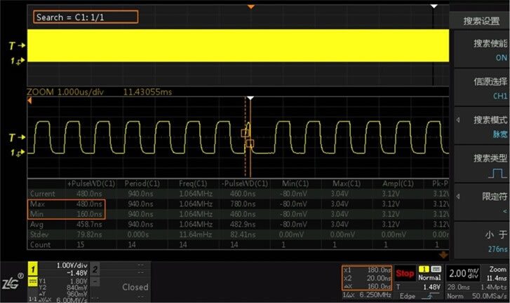 ZDS2022示波器测得的“正脉冲宽度”测量项的最大值为480.0ns,最小值为160ns,并且开启搜索模式之后,设定脉宽时间小于276ns(搜索条件与MSO4054示波器相同),能准确定位搜索出异常脉冲。选中正脉冲宽度测量项,可精确测量出异常脉冲宽度值。一键【ZOOM】放大,按下导航浏览软键,我们在副时基中清楚看到搜索到的异常窄脉冲。