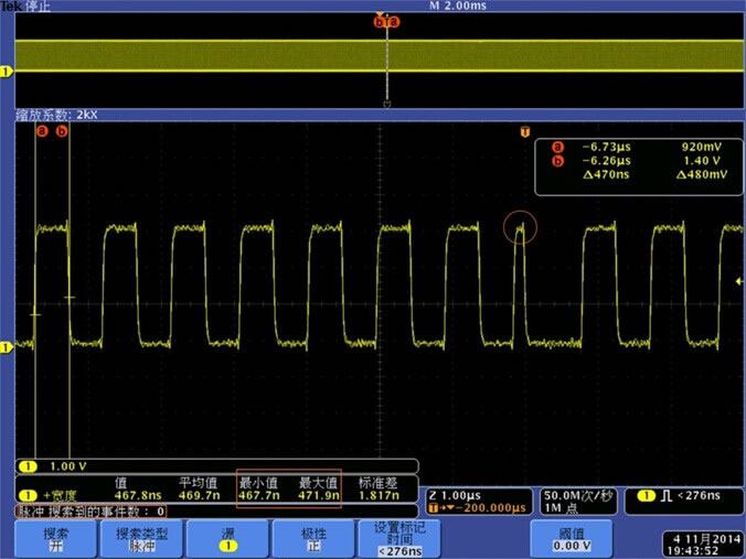 我们现在虽然将异常窄脉冲搜索出来了,但是我们看正脉冲宽度的测量结果还是不能显示出信号中混有异常窄脉冲,我们移动水平偏移旋钮,当异常窄脉冲移到屏幕左侧时,正脉冲宽度测量的最大值与最小值就变成了异常窄脉冲的宽度,可见,它真的就只是测量一个周期!真正的伪测量!而ZDS2022示波器只要是信号中存在异常,它都无可遁形,必然将它搜索出来,精确定位,准确测量!而MSO4054示波器不仅不能将其搜索出来,而且在利用触发功能将异常触发出来后,在测量时,示波器竟然对异常脉冲自动忽略,将其不划在测量范围内!因为该示波器是“伪测量”!
