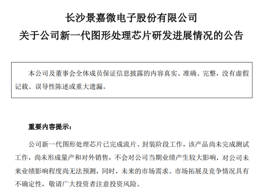 9月14日,景嘉微发布公告称,公司新一代图形处理芯片已完成流片、封装阶段工作,该产品尚未完成测试工作,尚未形成量产和对外销售,不会对公司当期业绩产生较大影响。