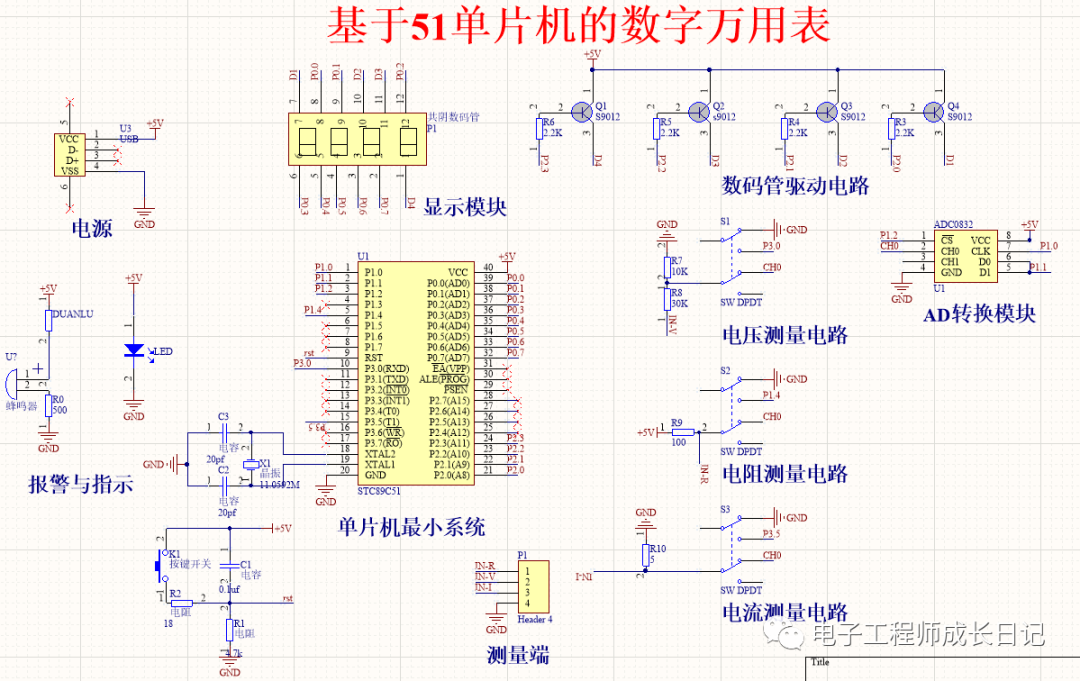 具体功能:万用表能够切换测量电压值、电流值以及电阻值,并且以四位数码显示,短路时会报警。
