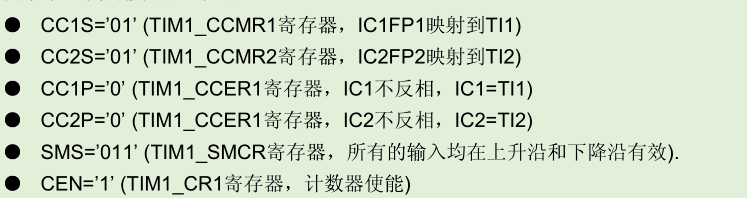 通道上面的步骤可以看到,要将定时器1设置为编码器模式时,需要设置 TIM1_CCMR1、TIM1_CCMR2、TIM1_CCER1、TIM1_SMCR、TIM1_CR1这几个寄存器。