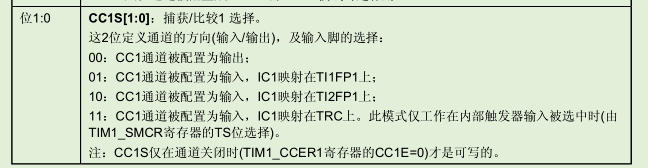 TIM1_CCMR1 |= 0x01; //通道位输入 CC1通道映射在 TI1FP1 上