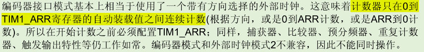 编码器的模式2的意思就是,根据TIM1_CH2通道输入电平信号,然后对TIM1_CH1通道的电平跳变情况计数。