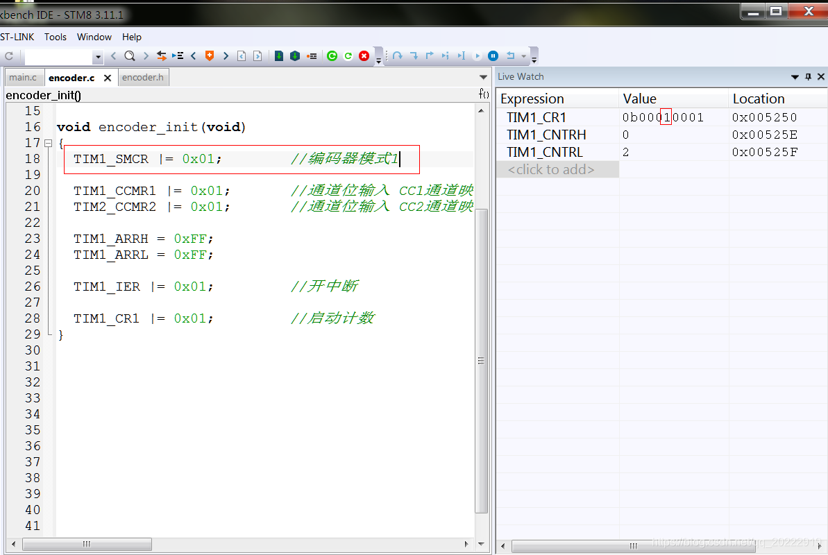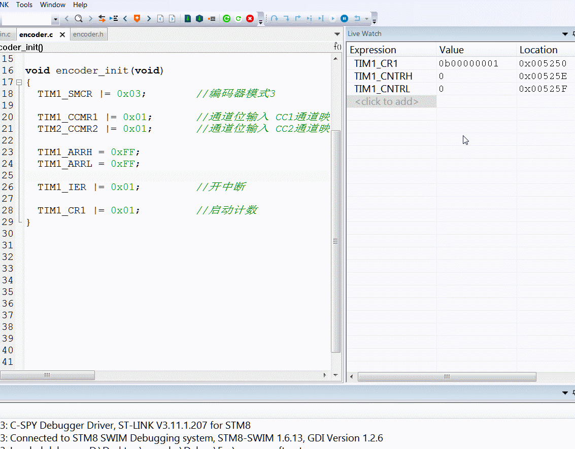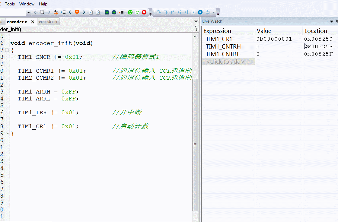 接下来还需要将TIM1的计数器添加到变量观察窗口,这样在旋转编码器的时候,就可以看到计时器值变化情况了。