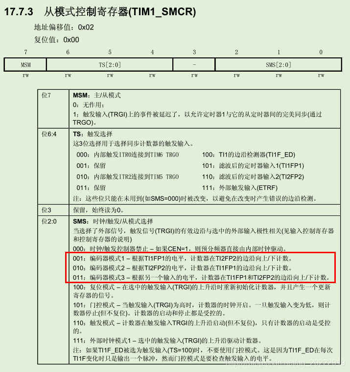 编码器的模式有3种,这个可以从TIM1_SMCR寄存器中的SMS位看出。