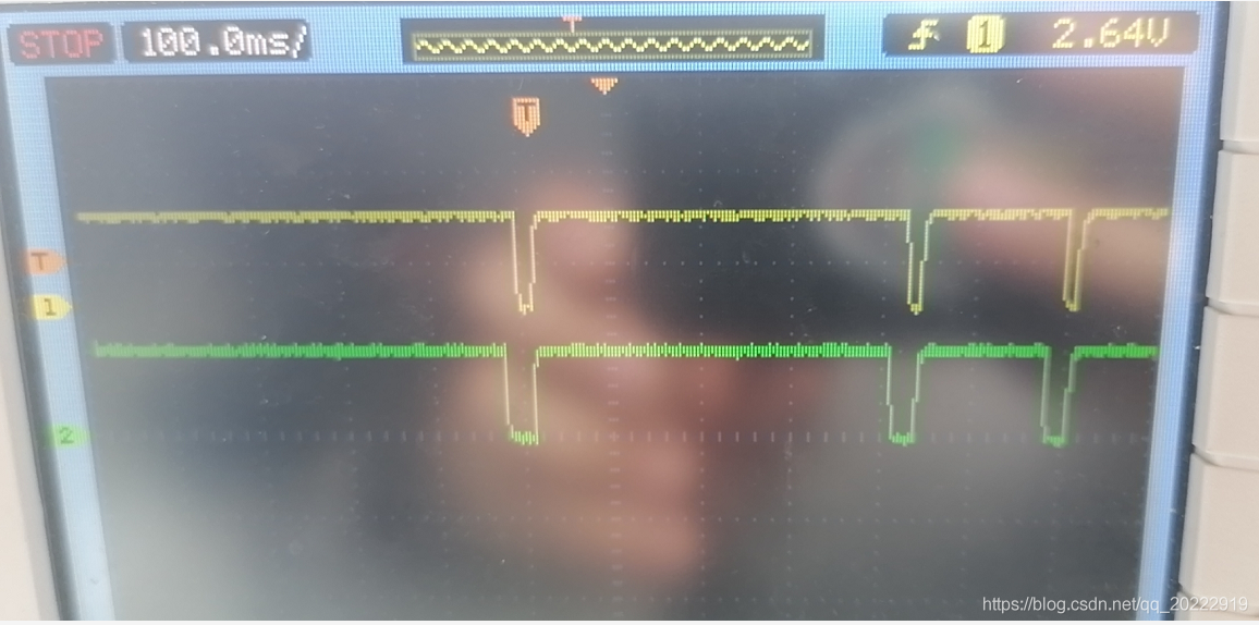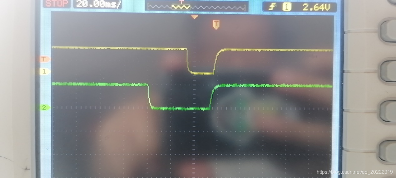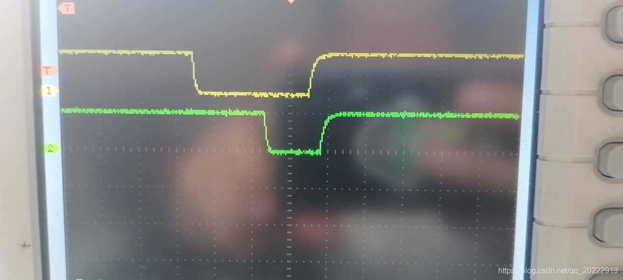 由于编码器器外部电路中接有电容,所以波形有一个上升沿和下降沿的过程,不是标准的方波,这里为了看起来方便,所以编码器只是轻轻的拧了一下,所以只有一个脉冲。