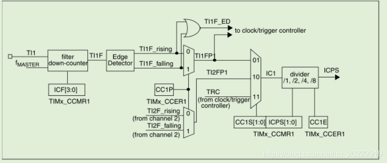 性选择的边缘监测器产生一个信号(TIxFPx),它可以作为触发模式控制器的输入触发或者作为捕获控制。该信号通过预分频进入捕获寄存器(ICxPS)。