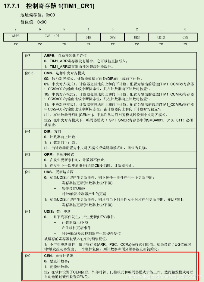 最后还需要设置TIM1_CR1寄存器,用来开启定时器。