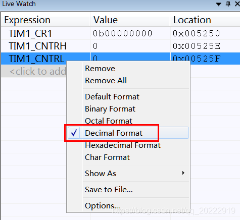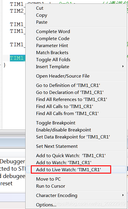 然后选中 TIM1_CR1寄存器,单击鼠标右键,选择Add to Live Watch:‘TIM1_CR1’