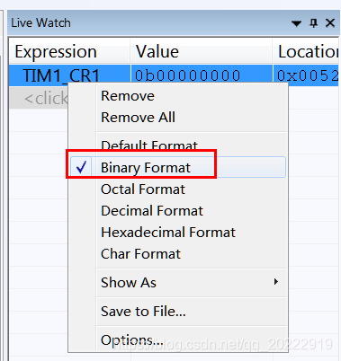 在TIM1_CR1寄存器上单击鼠标右键选择Binary Format格式,使用二进制格式查看TIM1_CR1寄存器的值。