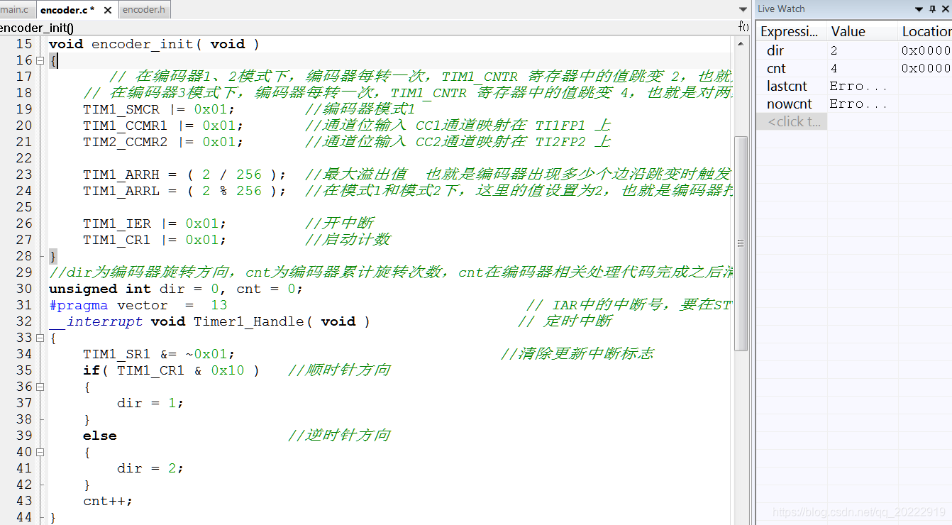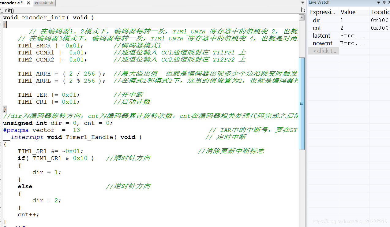 直接单击观察窗口里面 然后直接输入要观察的寄存器就行 将高8位计数器低8位计数器都输入进去,然后在寄存器上单击鼠标右键,选择Decimal Format模式,也就是通过10进制数观察。 观察变量值变化 接下来全速运行程序,然后旋转编码器。观察这几个寄存器值的变化情况。 可以看到编码器旋转一下,计数器里面的值就增加4 编码器向相反方向旋转,计数器里面的值就减4,同时TIM1_CR1寄存器第5位值变成了1. 通过芯片手册可以看到 当DIR值为0时,计数器是向上计数,当DIR值为1时,计数器是向下计数。 这里为什么编码器拧一下时,计数器值会跳变4呢? 因为这里设置的是模式3,在模式3下,计数器会对A端子和B端子的波形全部计数。 当编码器拧一次时,A和B都会出现一个低电平,总共有4次电平跳变,所以计数器就会计数4次。 所以在使用模式3时,统计编码器旋转次数时,需要用计数器的值除以4,才是真正编码器旋转的次数。 下面将编码器模式改为1,看看拧一次编码器时,计数器值变化是多少? 将编码器模式改为1之后,每次旋转编码器,计数器的值变化为2,DIR方向位的变化和模3一样。 通过上面的动态图片可以看出,当DIR值为0时,计数器的值向上增加,每次增加2.当DIR的值为1时,计数器的值向下减小,每次减小值为2.当减小到0时,计数器的值就会变为最大值,然后从最大值继续向下减小。如果向上增加时,增加到最大值后,就会自动变为0,然后继续从0开始增加。 这个现象和文档中描述的一样。 编码器用法总结 通过上面的观察就可以总结出编码器的用法: 当编码器模式设置为模式1和模式2时,编码器每旋转一次,计数器的值就加2。当编码器模式设置为模式3时,编码器每旋转一次,计数器的值就加4。这样通过读计数器的值就可判断出编码器旋转了多少下,同时通过TIM1_CR1寄存器中的DIR位就可以判断出,编码器的旋转方向。 按照这个思路,编写编码器读取代码: 查询方式读取 void encoder_init( void ) { // 在编码器1、2模式下,编码器每转一次,TIM1_CNTR 寄存器中的值跳变 2,也就是只对一组信号的边沿跳变计数 // 在编码器3模式下,编码器每转一次,TIM1_CNTR 寄存器中的值跳变 4,也就是对两组信号的边沿跳变全部计数 TIM1_SMCR |= 0x01; //编码器模式1 TIM1_CCMR1 |= 0x01; //通道位输入 CC1通道映射在 TI1FP1 上 TIM2_CCMR2 |= 0x01; //通道位输入 CC2通道映射在 TI2FP2 上 TIM1_ARRH = ( 60000 / 256 ); //最大溢出值 也就是编码器出现60000个跳变沿时才会 触发中断 TIM1_ARRL = ( 60000 % 256 ); TIM1_CNTRH = ( 30000 / 256 ); //计数器设置为中间值,这样旋转编码器的时候,计数器值就会在中间值的基础上增大或者减小 TIM1_CNTRL = ( 30000 % 256 ); TIM1_CR1 |= 0x01; //启动计数 } //dir为编码器旋转方向,cnt为编码器累计旋转次数,cnt在编码器相关处理代码完成之后清零。 unsigned int dir = 0, cnt = 0; //读取计数器值 在main函数中循环调用此函数 void read_encoder( void ) { static unsigned int lastcnt = 30000; //上次计数器值 static unsigned int nowcnt = 0; //本次计数器值 if( TIM1_CR1 & 0x10 ) //顺时针方向 { dir = 1; } else //逆时针方向 { dir = 2; } nowcnt = TIM1_CNTRH * 256 + TIM1_CNTRL ; if( nowcnt != lastcnt ) //计数器值变化,说明编码器旋转了 { if( nowcnt >= lastcnt ) cnt += ( nowcnt - lastcnt ) / 2; //在编码器1、2模式下,编码器每转一次,TIM1_CNTR 寄存器中的值跳变 2,除以2就是编码器旋转的次数 else cnt += ( lastcnt - nowcnt ) / 2; //如果初始化中编码器的模式选择是3,在这里就要除4 } lastcnt = nowcnt; } 将ARR的值设置为60000,将CNTR的值设置为30000,这样编码器在旋转的过程中就会从30000开始往上加,或者往下减。避免了编码器在加减过程中产生溢出,方便对编码器旋转次数的计算。 在主程序中每 100ms 调用一次read_encoder函数,然后通过当前计数器中的值是否发生改变来判断编码器是否发生了旋转。计数器中的值默认为30000,如果发现当前编码器中的值不等于30000,那么就说明编码器发生了旋转,然后计算旋转的差值,然后除以2就是编码器转动的次数。这里除2是应为当前编码器工作在模式1下,如果工作在模式4下,那么就要除以4。 通过变量监控可以看出,当前计数器中的值为29982,而默认计数器中的值为30000,计数器相差了18,然后使用18除以2,可以计算出编码器旋转了9次。 这里cnt就表示编码器旋转的次数,在统计旋转此时的时候,要使用+=号来计算,而不能直接使用=号来计算。这是因为人手动在旋转编码器的过程中,中间有时候会有停顿。如果直接使用=来计算两次数据的差时,只会将最后编码器旋转的值计算进去,而中间抖动之前的值就会默认为上一次旋转的值。 这是一次连续的旋转过程。 这也是一次旋转过程,但是在转动的时候中间稍微有停留。 如图所示,这是一次旋转的过程,但是在中间稍微有停留。就会导致中间有一段时间计数器的值没有发生变化。如果每次值发生变化时,直接使用=去读取两次计数器的差,就会把上面这种认为是2次旋转,第一次旋转到来之后,程序还没做响应动作,第二次旋转又立马发生了,这样计算出来的cnt就只是第二次这一点数据变化,但实际上对应人的操作来说,这是一次旋转操作。 所以在计算cnt值时,要使用+=来累计统计旋转的次数,就会将一次旋转过程中所有的变化都累加起来。这样在用手拧编码器的时候,就算中间稍微有停留,程序也能正确的检测到。 中断方式读取 上面是通过查询的方式来计算编码器的旋转