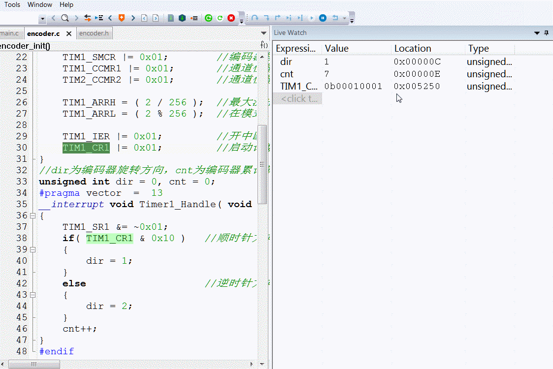 将TIM1_CR1寄存器添加到实时监控的窗口中,因为TIM1_CR1寄存器中的DIR 位会显示编码器旋转的方向。这样在编码器旋转的过程中,就可以实时看到这个寄存器中值的变化情况了。