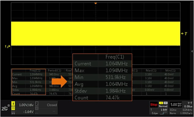 首先来看下ZDS2022示波器是怎样一种情况,输入一个频率约为1MHz的信号,由于ZDS2022示波器存储深度可高达112Mpts,按下【Horiz】键,将储存深度设为112Mpts,转动水平时基旋钮,将水平时基档位设为5ms/div。按下【Measure】键,我们选中一些时间参数与电压参数,按下【Single】单次采样键,我们在测量结果列表中可以看到有些count值显示为1,有些count值却是一个很大的数值,这是怎么回事呢?