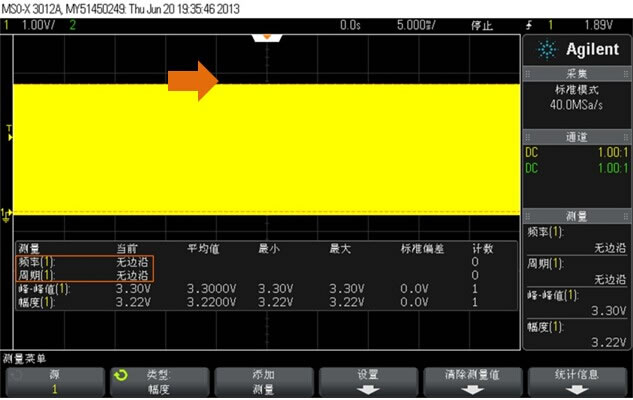 手头正好有A公司的MSO-X3012A示波器,输入同一信号,水平时基档位也设为5ms/div,MSO-X3012A示波器虽然共有34个测量参数,但是却只能同时实时显示4个参数项,选中两个时间参数和两个电压参数,按下【Single】之后,我们在屏幕上可以看到,电压参数计数值均为1,但是时间参数的频率和周期的计数却为0,当前值显示无边沿,这究竟是怎么回事呢?