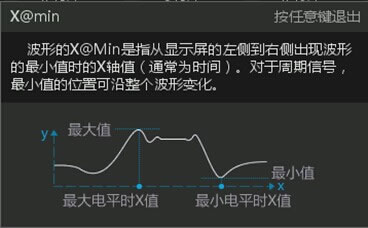 短按旋钮B,您就可以打开所选参数项的解释帮助信息,ZDS2022示波器就相当于一个智能小词典,哪里不懂点哪里,原来,该测量项的含义是指从显示屏的左侧到右侧出现波形的最大或最小值时的X值,并且对于周期信号,最小值的位置可沿整个波形而变化。