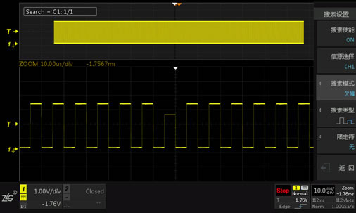 现在我们就来看下ZDS2022示波器的搜索功能,由于采用全硬件搜索,搜索速度非常快!不多说,我们来试一下,按下【Measure】键,在搜索设置中打开搜索使能,选择正确的信源,搜索模式设为欠幅,搜索类型设为正向欠幅,限定符是用来进一步来设定欠幅波形的宽度的,使您的搜索条件设置的更加具体,我们这里将限定符设定为无。按下【Single】键,在屏幕左上方我们会看到搜索结果,一键【Zoom】放大,按下导航浏览键,减小水平时基档位,在放大区中我们可看到搜索出来的欠幅波形,定位非常精准,而且波形放大后并没有失真,112Mpts的存储深度,在能够记录较长时间的波形存储时,仍能保证较高的采样率!