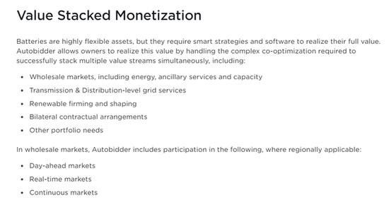 最近看到一个很有意思的东西,特斯拉正在建立一个交易员团队来面向未来交易能源(电力),这个平台叫Autobidder 平台,可以对能源进行实时交易和控制,如 Tesla 的 Powerpacks、Powerwalls 和 Megapacks,通过机器学习进行优化,以更好地利用资产并更直接地将资产货币化,目前已经管理了超过 1.2 GWh的储能。