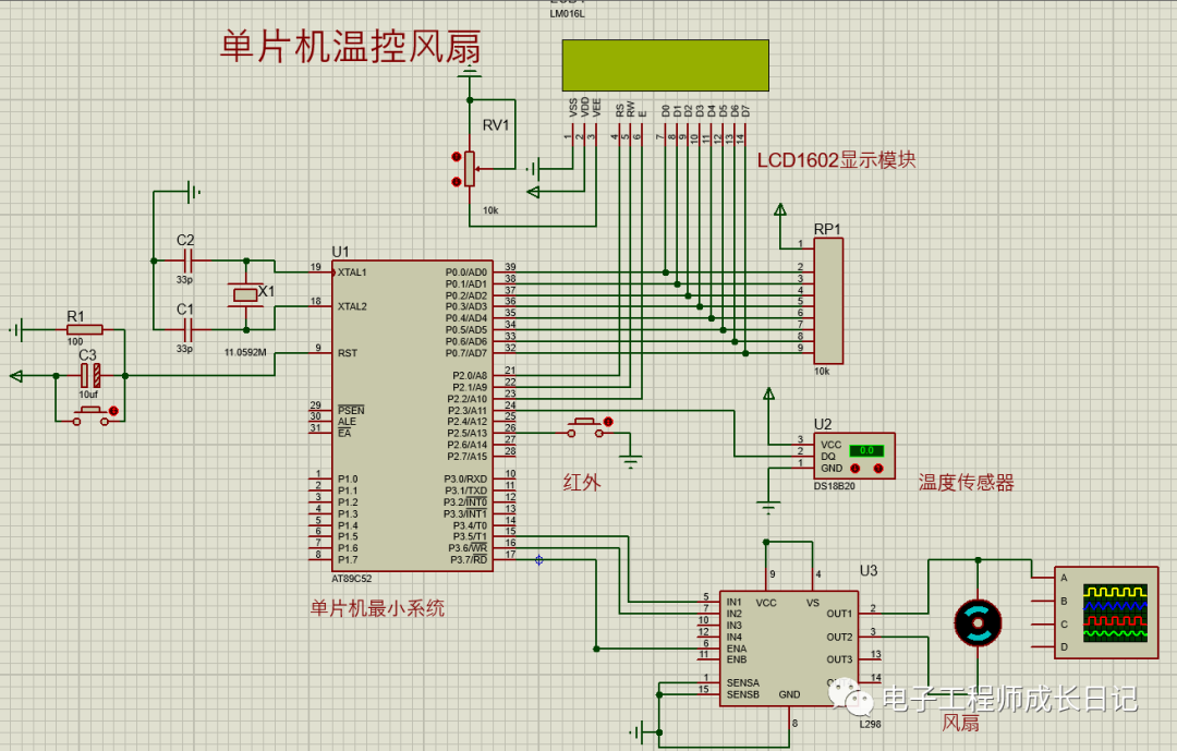 系统由STC89C51单片机+LCD1602液晶显示屏+L298N控制模块+直流电机+DS18B20温度传感器构成。