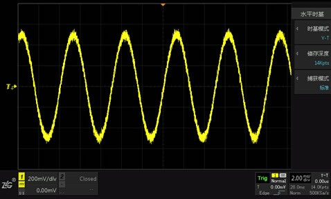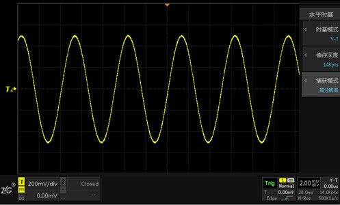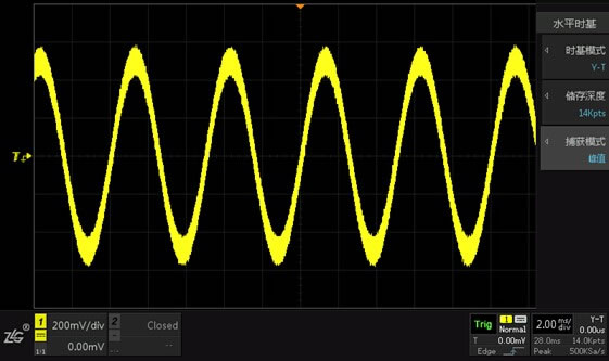 首先我们来看下“标准”模式,在一般情况下,如果您对示波器捕获波形的方式没有特殊要求时,捕获模式可以设置为标准模式。标准捕获模式下,示波器会按照相等的时间间隔对信号进行采样。对于大多数波形来说,使用该模式可产生良好的显示效果。ZDS2022示波器的默认捕获模式也是标准模式。