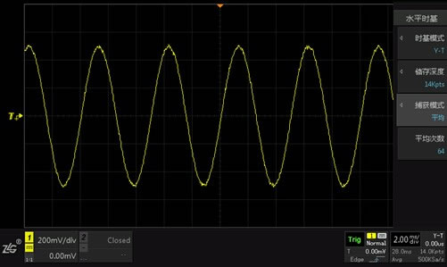 现在再来看下平均和高分辨率捕获模式,在平均捕获方式中,可先设置一个平均次数N,之后示波器会对采集的N段波形,将它们按照触发位置对齐,对N段波形进行平均运算,最终得到一段平均后的波形。在ZDS2022示波器中平均数可设置的范围是2~65536,系统默认设为64次。使用平均模式,可以减少波形中的随机噪声。