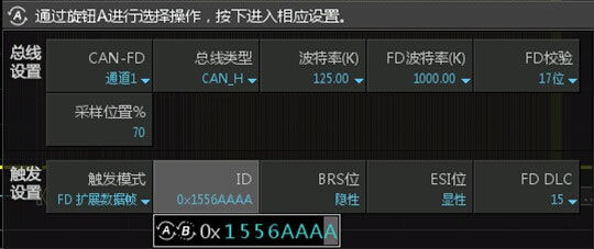 按下【Decode】键,将解码类型设为CAN FD,该示波器在协议解码模块中同样支持协议触发的设置,打开协议触发,一键【Auto/Normal】将触发方式切换至普通触发方式,然后在协议参数中设置合适的参数,检查协议通道设置是否正确,设置合适的总线类型,我们将波特率设为125K,FD波特率设为1M,FD校验位设为17位,采样位置默认70%不变。由于已打开协议触发,所以在这里可以对触发进行设置,触发模式选择FD扩展数据帧,然后再进行ID设置,旋转旋钮A可以调整数值,旋转旋钮B可以调整数字的位置,在示波器中,旋钮A与旋钮B是两个非常神奇的旋钮。BRS位设置为隐形,ESI位设置为显性,数据长度设置为15。