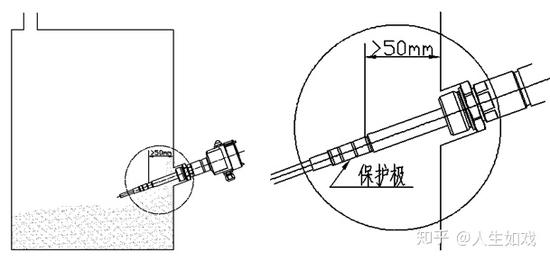 计为自动化旗下的射频导纳料位开关,目前主要有通用型、防护型、缆绳型、超高温型射频导纳料位开关,上述四种型号的射频导纳料位开关,均设计有保护极。在安装计为射频导纳料位开关时,同样要遵循向下倾斜20°、探头的保护极插入料仓内的尺寸满足大于50mm的要求,以保证仪表具有更好地抗粘附性。如下图所示: