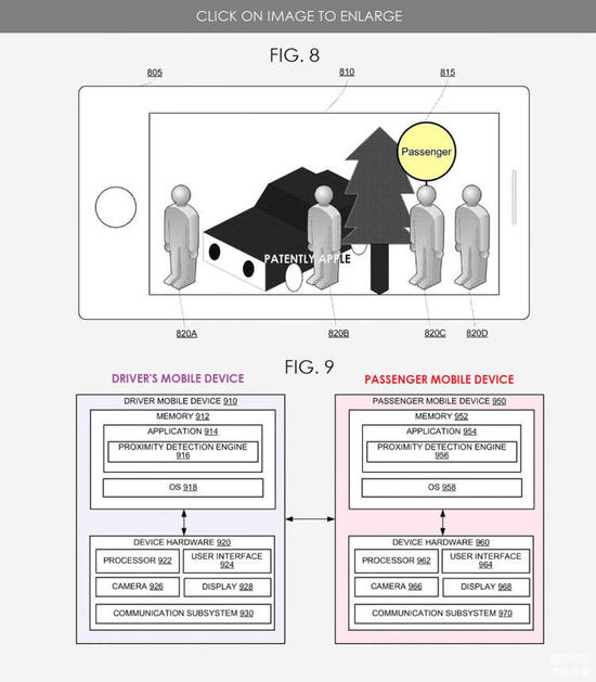 苹果专利图8展示了采用增强现实技术识别乘客的移动设备显示器上的图形用户界面;图9是一个框图,展示了执行近距离感知的增强现实系统。