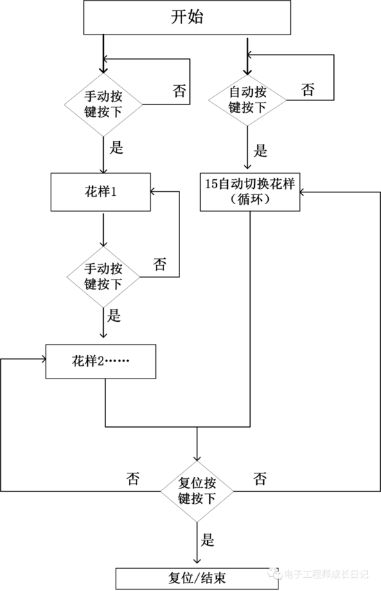 (2)彩灯花样变换的快慢节拍可以手动和自动方式控制,手动控制按钮按一次转换一次;自动控制方式每15秒变换一次,1分钟循环一遍;
